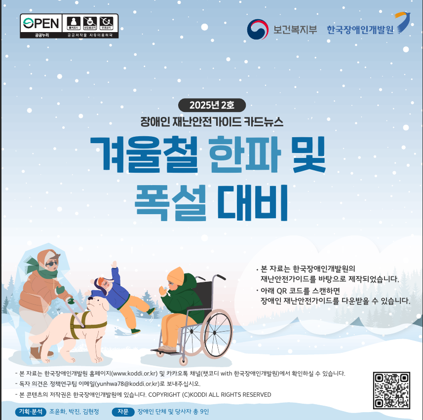 장애인 재난안전가이드 카드뉴스 2025년 02호(한파 폭설 대비) 페이지 정보 작성일 25-12-03 14:12 본문 장애인 재난안전가이드 카드뉴스 2025년 02호(한파 폭설 대비)첨부파일 있습니다. 첨부파일 123456-78.pdf (566.3K) 2회 다운로드 | DATE : 2025-12-03 14:37:06 목록 다음글2025년 연제장애인자립생활센터 상반기 소식지 25.10.21