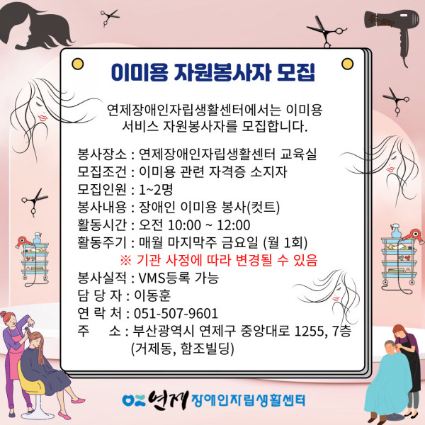 연제장애인자립생활센터에서는 이미용 서비스 자원봉사자를 모집합니다.