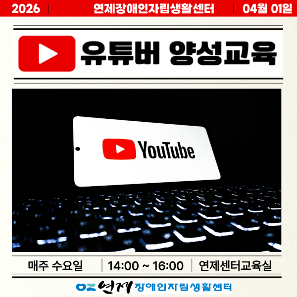 연제장애인자립생활센터에서는 1인 미디어 역량 강화를 위한 「유튜버 양성교육 프로그램」 참여자를 모집합니다.