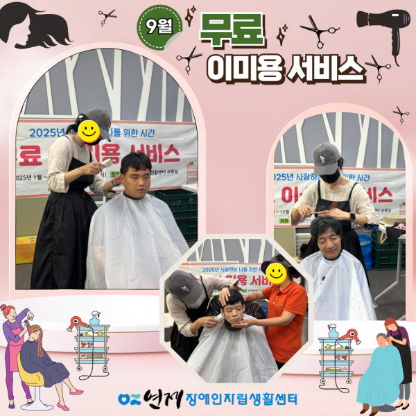 2025년 9월 무료 이미용 서비스 ♥♥ 페이지 정보 작성일 25-09-25 16:50 본문 2025년 9월 무료 이미용서비스일시: 2025년 9월 25일 (목) 10:00~12:00장소: 연제장애인자립생활센터 교육실 목록 이전글뉴스포츠 자조모임 11회차 ♥ 25.09.25 다음글파워휠 보치아 자조모임 교류전 18회차 ♥ 25.09.22