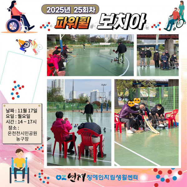 파워휠 보치아 정기모임 25회차 ♥ 페이지 정보 작성일 25-11-18 13:59 본문 파워휠 보치아 자조모임 25회차장소 : 온천천시민공원 농구장일시 : 11월 17일(월) 14:00 ~ 17:00 목록 다음글지역사회 캠페인-8회차 ♥ 25.11.18