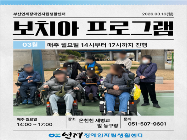 ♥ 파워휠 보치아 정기모임 02회차 ♥ 페이지 정보 작성일 26-03-16 17:22 본문 누구나 함께하는 보치아 자조모임, 그 현장 공개!2026년 3월 16일 월요일,연제장애인자립생활센터 보치아 자조모임은온천천 세병교 앞 농구장에서 진행되었습니다.보치아 자조모임은 매주 정해진 시간에 모여참여자분들과 함께 소통하고 즐겁게 활동하는 프로그램으로,오후 2시부터 5시까지 진행되었습니다. 목록 이전글♥ 파워휠 보치아 정기모임 03회차 ♥ 26.03.24 다음글♥ 파워휠 보치아 정기모임 01회차 ♥ 26.03.09