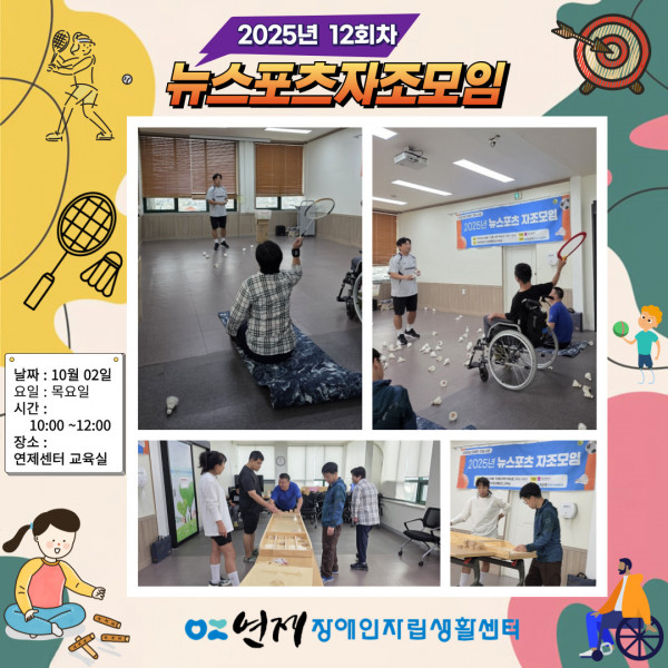뉴스포츠 자조모임 12회차 ♥ 페이지 정보 작성일 25-10-02 14:22 본문 뉴스포츠자조모임 12회차장소 : 연제장애인자립생활센터 교육실날짜 : 10월 02일요일 : 목요일시간 : 10:00 ~ 12:00 목록 다음글뉴스포츠 자조모임 11회차 ♥ 25.09.25