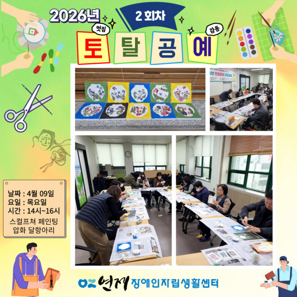 토탈공예 자조모임 2회차 ♥ 페이지 정보 작성일 26-04-10 11:04 본문 일시: 2026년 04월 09일 (목요일 14:00~16:00)내용: 토탈공예 자조모임장소: 연제장애인자립생활센터 교육실 목록 다음글♥ 유튜버 양성교육 02회차 ♥ 26.04.08