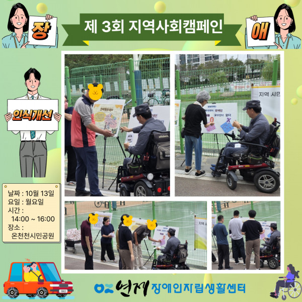 지역사회 캠페인-3회차 ♥ 페이지 정보 작성일 25-10-13 16:43 본문 장애인은 운전 학원을 갈 수 있다, 없다'로 지역사회 캠페인을 진행하였습니다.^^장소 : 온천천 시민공원 일원날짜 : 10월 13일요일 : 월요일 목록 이전글파워휠 보치아 정기모임 20회차 ♥ 25.10.13 다음글파워휠 보치아자조모임 리그전 19회차 ♥ 25.10.13