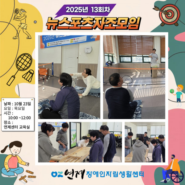 뉴스포츠 자조모임 13회차 ♥ 페이지 정보 작성일 25-10-23 13:36 본문 뉴스포츠자조모임 13회차장소 : 연제장애인자립생활센터 교육실날짜 : 10월 23일요일 : 목요일시간 : 10:00 ~ 12:00 목록 이전글2025년 10월 무료 이미용 서비스 ♥♥ 25.10.23 다음글파워휠 보치아 정기모임 21회차 ♥ 25.10.20