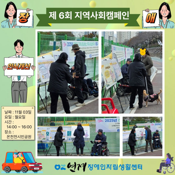 지역사회 캠페인-6회차 ♥ 페이지 정보 작성일 25-11-04 14:28 본문 장애인은 운전 학원을 갈 수 있다, 없다'로 지역사회 캠페인을 진행하였습니다.^^장소 : 온천천 시민공원 일원날짜 : 11월 03일요일 : 월요일 목록 이전글파워휠 보치아 정기모임 23회차 ♥ 25.11.04 다음글2025년 동아대학교 난장토론회 ♥ 25.11.04