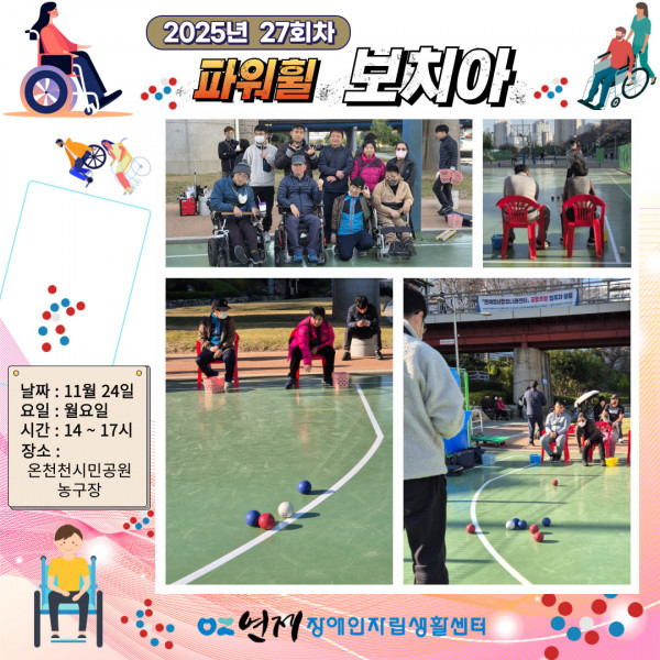 파워휠 보치아 정기모임 27회차 ♥ 페이지 정보 작성일 25-11-24 16:38 본문 파워휠 보치아 자조모임 27회차장소 : 온천천시민공원 농구장일시 : 11월 24일(월) 14:00 ~ 17:00 목록 이전글2025년 11월 무료 이미용 서비스 ♥♥ 25.11.25 다음글파워휠 보치아자조모임 리그전 26회차 ♥ 25.11.24