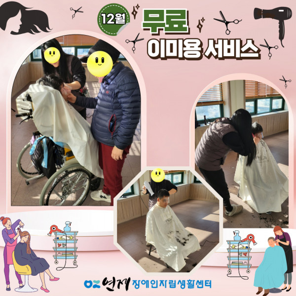 2025년 12월 무료 이미용 서비스 ♥♥ 페이지 정보 작성일 26-01-02 13:57 본문 2025년 12월 무료 이미용서비스일시: 2025년 12월 26일 (금) 10:00~12:00장소: 연제장애인자립생활센터 교육실 목록 이전글2025년 자립역량강화 ILP 『전지적 자립생활 시점』 12회차 26.01.02 다음글2025년 자립역량강화 ILP 『전지적 자립생활 시점』 11회차 25.12.22
