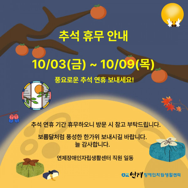 2025년 연제센터 추석 연휴 휴무 안내 페이지 정보 작성일 25-10-01 13:35 본문 2025년 10월 03일 (금요일)~2025년 10월 09일 (목요일) 까지 추석 연휴로 인하여 센터 휴무임을 알려드립니다.즐거운 한가위 보내세요.^^ 목록 답변 이전글사회복지사 채용공고 25.10.02 다음글2025년 연제장애인자립생활센터 상반기 소식지 25.09.25