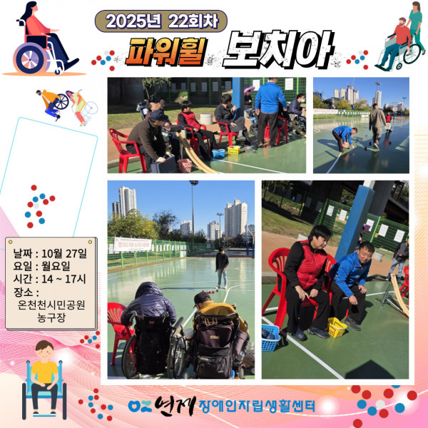 파워휠 보치아 정기모임 22회차 ♥ 페이지 정보 작성일 25-10-27 16:42 본문 파워휠 보치아 자조모임 22회차장소 : 온천천시민공원 농구장일시 : 10월 27일(월) 14:00 ~ 17:00 목록 다음글지역사회 캠페인-5회차 ♥ 25.10.27