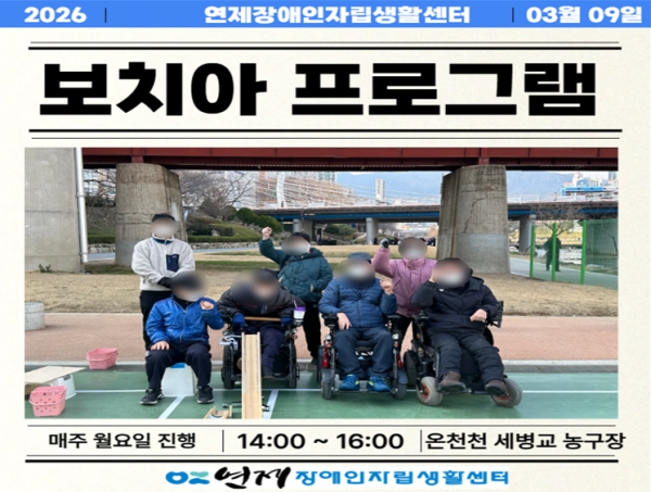 파워휠 보치아 1회차 활동후기 페이지 정보 작성일 26-03-09 17:14 본문 파워휠 보치아 자조모임 01회차장소 : 온천천 '세병교' 농구장 일시 : 03월 09일(월) 14:00 ~ 17:00누구나 함께하는 보치아 자조모임, 그 현장 공개! 목록 이전글♥ 파워휠 보치아 정기모임 02회차 ♥ 26.03.16 다음글2026년 2월 무료 이미용 서비스 ♥♥ 26.02.27