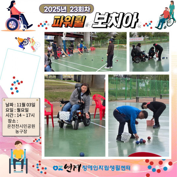파워휠 보치아 정기모임 23회차 ♥ 페이지 정보 작성일 25-11-04 14:30 본문 파워휠 보치아 자조모임 23회차장소 : 온천천시민공원 농구장일시 : 11월 03일(월) 14:00 ~ 17:00 목록 다음글지역사회 캠페인-6회차 ♥ 25.11.04