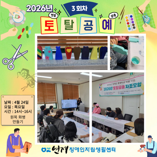 토탈공예 자조모임 3회차 ♥ 페이지 정보 작성일 26-04-23 17:45 본문 일시: 2026년 04월 24일 (목요일 14:00~16:00)내용: 토탈공예 자조모임장소: 연제장애인자립생활센터 교육실 목록 이전글2026년 4월 무료 이미용 서비스 ♥♥ 26.04.24 다음글♥ 유튜버 양성교육 04회차 ♥ 26.04.22